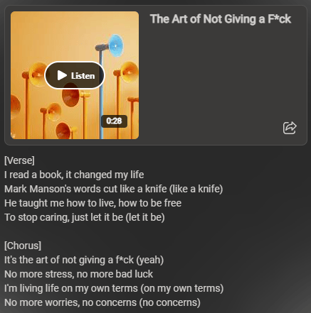 Tell Copilot What You Want: Describe the song you want in the Copilot chat. Keep it simple. For example, we asked for a "Generate a song based on Mark Manson's book "The subtle art of not giving a f*ck".