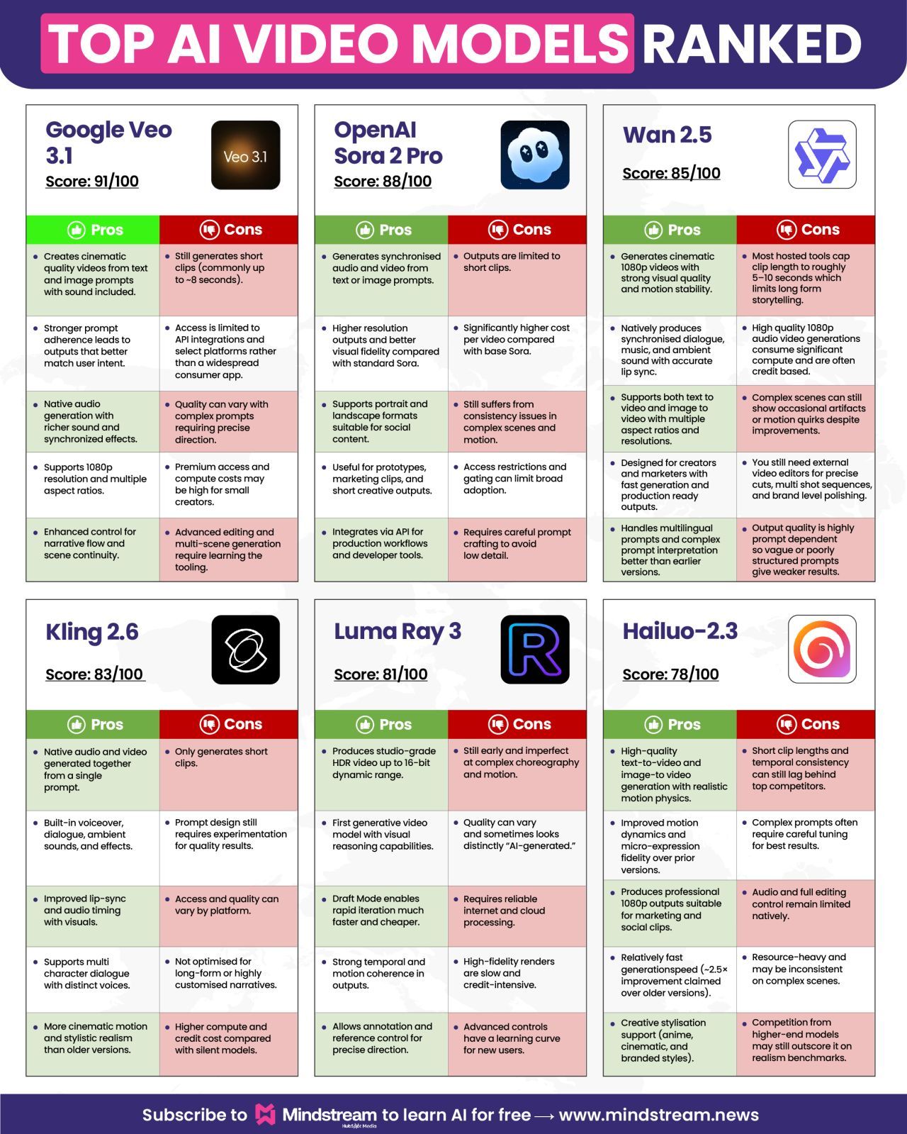 The analysis focuses heavily on the current titans of the industry: Google Veo 3.1 and OpenAI Sora 2 Pro. The creator of this guide didn’t just look at visual fidelity; they scored them based on prompt adherence, audio synchronization, and usability for actual work versus side projects. Google Veo 3.1 took the top spot with a score of 91/100, edging out Sora 2 Pro, which landed at an 88/100. It is fascinating to see how close the race is becoming, especially when you factor in native audio generation capabilities.