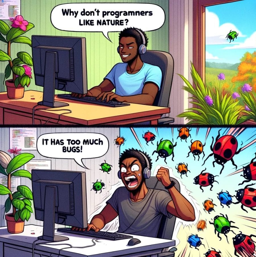 DALL-E: 2 pictures meme. Why don't programmers like nature? It has too many bugs! 1-st picture: relaxed guy programming 2-nd picture: furious programmer fighting bugs