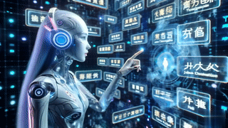 DALL-E 3 PROMPT: A cyber-girl surrounded by holographic images of different languages. She interacts with a virtual teacher - a projection of ChatGPT, which assists her in learning new words and phrases. format 16:9