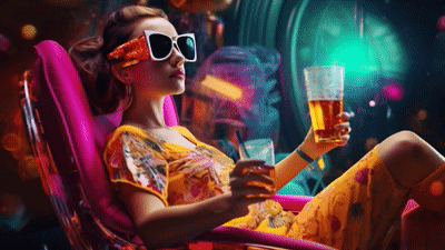 MIDJOURNEY v5.2 PROMPT: young beautiful woman in a bright futuristic costume on a futuristic chair wearing futuristic glasses, drinking a colorful bubbling cocktail -- ar16:9 --s 1000