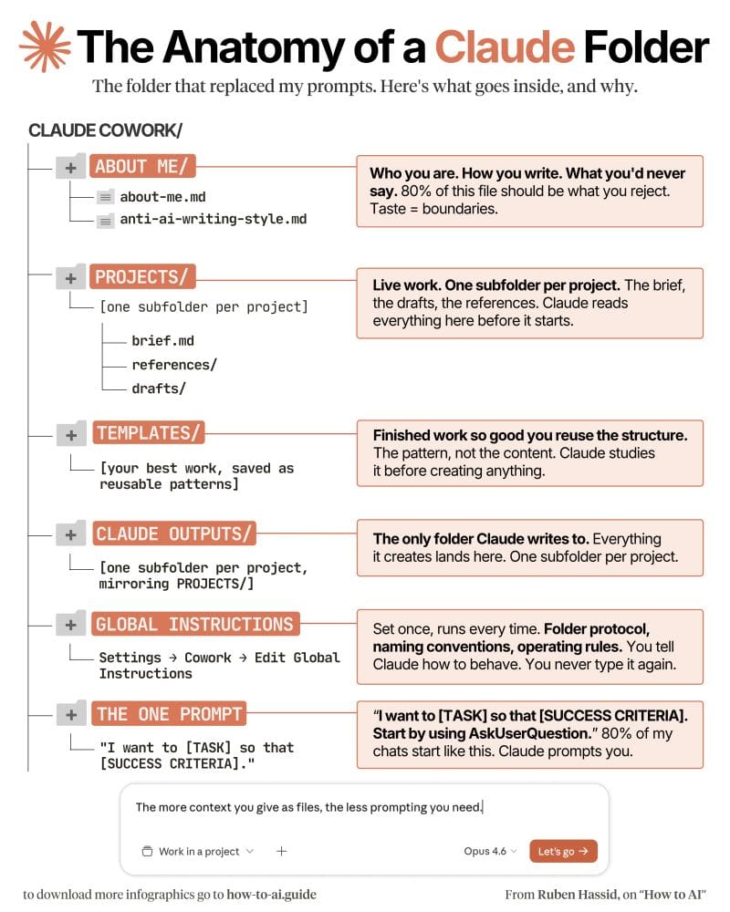 Make a folder on your computer called Claude Cowork. Every file inside replaces a prompt you'd type. The folder is the system prompt, you just point Claude at it. No more "here's the context again" 12 times a week.